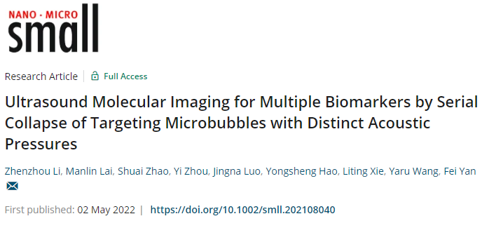 Zhenzhou Li; Manlin Lai; Shuai Zhao; Yi Zhou; Jingna Luo; Yongsheng Hao; Liting Xie; Yaru Wang, Fei Yan. Ultrasound molecular imaging for multiple biomarkers by serial collapse of targeting microbubbles with distinct acoustic pressures. Small, 2022, doi: 10.1002/smll.202108040