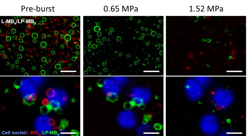 研究团队第一时间测试了L-MBα 和LP-MBv两种靶向微泡在水溶液混合条件下的声压爆破性能,发现红色荧光标记的L-MBα在0.65MPa声压条件下可以全部爆破清除,而绿色荧光标记的LP-MBv 基本不受影响,采用1.52MPa声压则可以将LP-MBv爆破清除;接着,研究团队将两种混合靶向微泡与血管内皮细胞孵育,使它们一同结合在血管内皮细胞(蓝色)的表面,顺利获得采用0.65MPa声压可以将结合在血管内皮细胞表面的L-MBα选择性爆破,进一步提高声压至1.52MPa 则可以将残留的LP-MBv 微泡爆破,由此实现了采用梯度声压逐个爆破清除靶向微泡的方法(图1)。