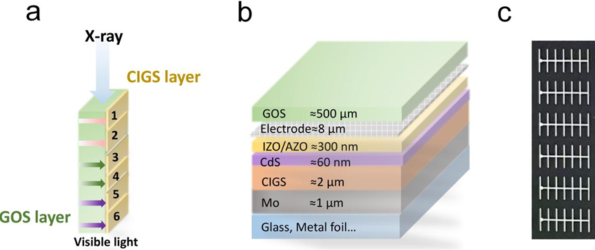 图1:a)3D结构间接型X射线探测器的示意图; b) CIGS光电功能层的器件结构;c) 光电器件的照片。
