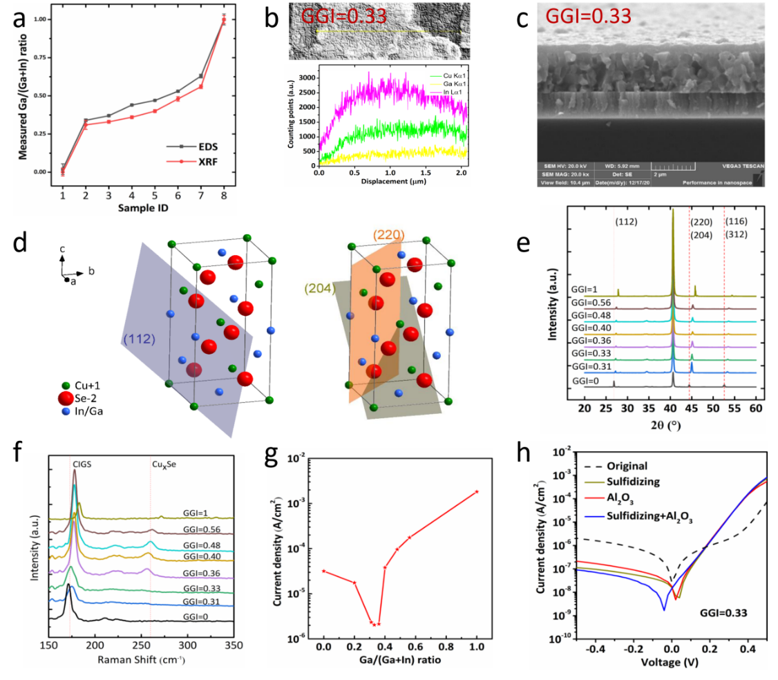 图2:a) 本研究中使用的CIGS薄膜的Ga/(Ga+In)元素比;b) Ga含量0.33的样品中各元素的空间分布;c) CIGS吸收层的截面电子显微镜照片;d) CIGS的晶体结构示意图;e) CIGS薄膜的晶体X射线衍射图谱;f) CIGS薄膜的拉曼光谱;g) CIGS光电器件的暗电流与Ga组分关系;h) 表面钝化处理后的CIGS器件的电流电压曲线。