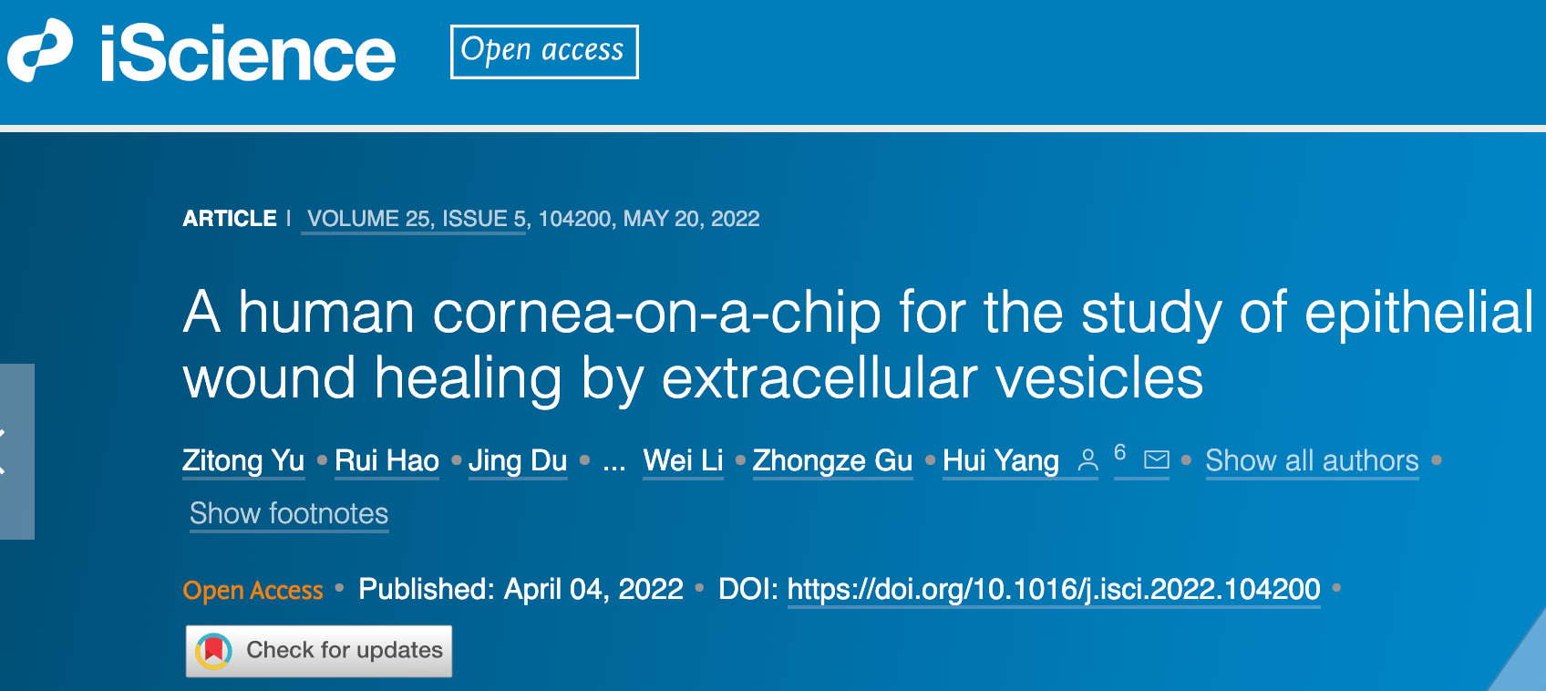 近期,中国科研实验室深圳先进技术研究院医工所杨慧研究员团队在干细胞外泌体促进人眼角膜损伤修复方面的研究取得阶段性成果。最新研究成果以“A human cornea-on-a-chip for the study of epithelial wound healing by extracellular vesicles”(人眼角膜芯片用于研究细胞外囊泡对角膜损伤的作用)为题发表于Cell旗下期刊iScience(iScience. 2022, DOI: 10.1016/j.isci.2022.104200)。凯发k8官网博士生于子桐为论文第一作者,杨慧研究员为通讯作者。
