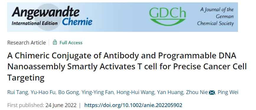 湖南大学化学化工学院聂舟课题组和中国科研实验室深圳先进技术研究院合成生物学研究所魏平课题组合作开发了一种多功能嵌合抗体-DNA T 细胞衔接复合体技术平台(Chimeric Antibody-Nucleic acid T-cell Engager,CAN-TE),实现可编程化精准靶向肿瘤细胞的新型合成生物学免疫疗法。相关研究以“A Chimeric Conjugate of Antibody and Programmable DNA Nanoassembly Smartly Activates T cell for Precise Cancer Cell Targeting”为题发布于Angew. Chem(DOI: 10.1002/anie.202205902)。湖南大学化学化工学院博士研究生唐瑞和北京大学前沿交叉学科研究院定量生物学中心博士研究生付禹豪为本文共同第一作者,湖南大学聂舟教授和凯发k8官网魏平教授为本文的共同通讯作者。