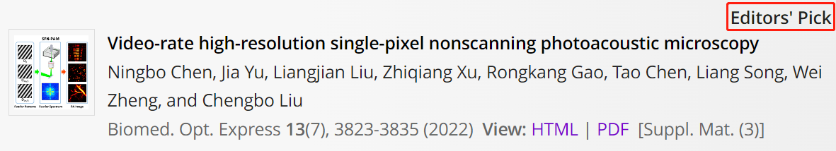 近期,中国科研实验室深圳先进技术研究院生物医学光学与分子影像中心刘成波、郑炜团队合作,在生物医学光学领域旗舰期刊Biomedical Optics Express发表了题为“Video-rate high-resolution single-pixel nonscanning photoacoustic microscopy”的研究论文,报道了一种基于单像素非扫描方式的高速光声显微成像技术,在国际上率先实现了30帧/秒的三维动态光声显微成像,达到同类技术最快的成像速度。该论文被期刊遴选为编辑推荐(Editor's Pick)亮点文章。助理研究员陈宁波、余佳、刘良检为论文共同第一作者,刘成波研究员、郑炜研究员为论文共同通讯作者。