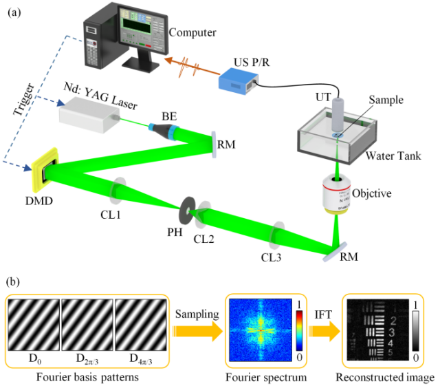 光声显微成像具备高分辨、三维无标记成像等优势,被广泛用于活体生物组织结构和功能成像。传统光声显微成像技术主要依靠逐点扫描进行三维图像采集,受限于步进电机、光学振镜等扫描器件的扫描速度局限,传统光声显微技术的成像速度远低于视频帧率(30 Hz),难以满足生物体快速生理活动监测的需求。针对该问题,研究团队提出了一种基于单像素成像技术的高速非扫描光声显微成像(SPN-PAM)。该技术利用高速数字微镜(DMD)实现成像区域的结构光场照明,顺利获得快速调制结构光场的傅里叶照明条纹,获取图像的变换域频谱信息,采用傅里叶频谱逆变换即可完成图像快速重建。