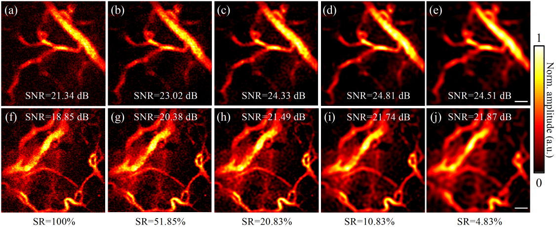 SPN-PAM技术无需逐点扫描成像,克服了扫描器件对成像速度的限制,此外,该技术能够充分利用图像在变换域独特的频谱稀疏特征,对频谱信息进行大幅压缩采样。活体成像结果表明,在4.86%的超低采样率下,该方法仍能够保持良好的图像分辨率和信噪比,同时成像速度得到大幅提升。基于此,研究团队首次实现了视频帧率(≥30 Hz)的高分辨光声显微成像。
