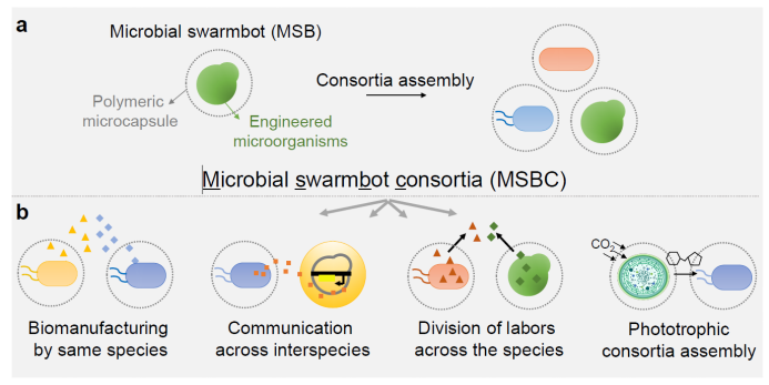 科研人员使用合成生物学工具对MSBC进行编程,实现了合成生物群落的分工与通讯,并构建了可实现光合自养的微生物群落: