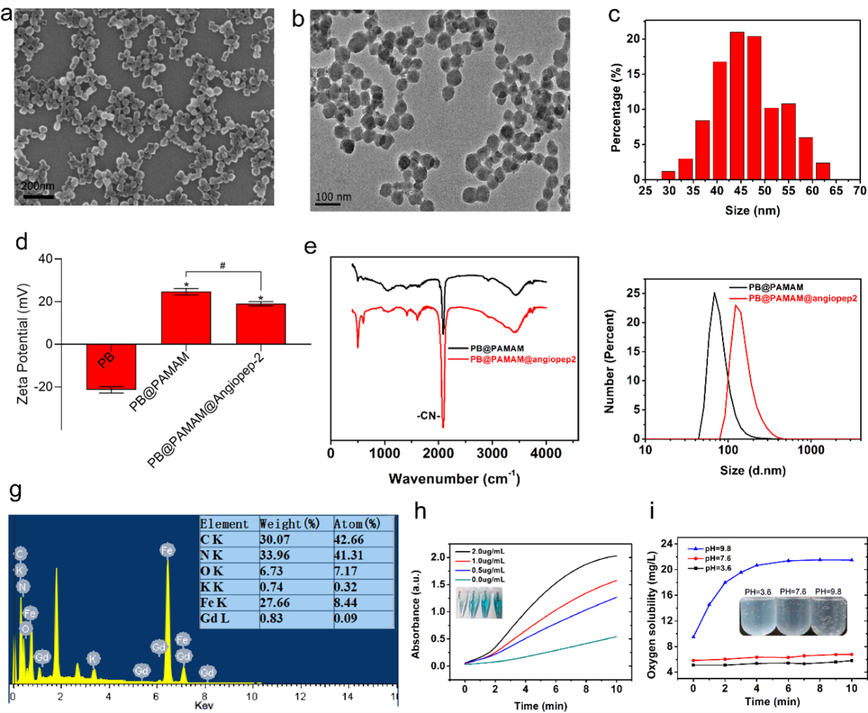 研究团队第一时间制备并表征了PPA纳米材料。扫描电子显微镜(SEM,图2a)和透射电子显微镜(TEM,图2b)分析显示,形成了直径为49±15 nm的球形纳米颗粒,并顺利获得动态光衍射分析(DLS)进一步证实纳米颗粒的尺寸(图2c)。Zeta电位检测显示PPA纳米颗粒电位在+23mV~+19mV范围内,扭转了普鲁士蓝原本负电荷(-22mV)在顺利获得血脑屏障的不利条件 (图2d)。红外光谱的特征性吸收峰、粒径分析均证实了ANG-2的成功引入(图2e,f)。此外研究团队还检测了PPA纳米颗粒过氧化物酶的活性,其结果显示PPA具有良好的过氧化物酶活性抗氧化性,并与PPA浓度呈正相关,这说明PPA具有良好的抗氧化性(图2h,i)。
