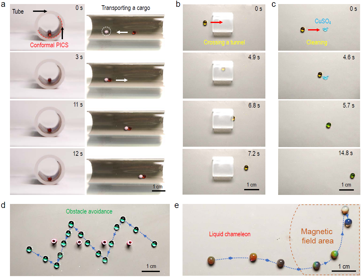 基于此,研究团队采用具有高效光热与导热性能的液态金属颗粒(LMP),与具有独特铁电效应的聚偏氟乙烯-三氟乙烯聚合物(P(VDF-TrFE))复合,成功构建了一种基于智能高分子材料的新型超双疏表面——PICS,顺利获得开尔文探针力显微镜(KPFM)揭示了该智能高分子材料表面电荷实时、原位、高效再生能力;研究发现,在较低光强的近红外光(NIR,100 mW cm-2)照射下,毫秒级内即可产生表面电荷密度高达252 pC mm-2,且PICS表面电荷高效再生能力在较高环境湿度(~90%)与温度(~70 ℃)等极端环境下几乎无影响,其电荷高效再生性能在持续10000次光照循环后仍维持稳定。基于PICS独特的光与电双重优势,研究团队实现了PICS上光控液滴高速(8 μL水滴,平均速度:~ 35.9 mm s-1)、长距离、多模态(向前、向后、旋转)、集体定向运动,且光控液滴高速运动在较高环境湿度、逾100次循环后仍能维持稳定,并可拓展到如高浓度氯化钠(1 M)等复杂溶液;研究团队还采用麦克斯韦应力张量模型分析验证了光控液滴运动机制;在此基础上,研究团队实现了光操控液滴在液滴机器人领域应用:光操控液滴在PICS共形贴合的管内搬运物体、穿梭小隧道、清除粉末、避障运动,及光操控液滴运动同时顺利获得液滴肉眼可见的颜色变化实时感知环境磁场变化;此外,研究团队还拓展了液滴机器人在细胞输运、生化检测等生物领域应用。
