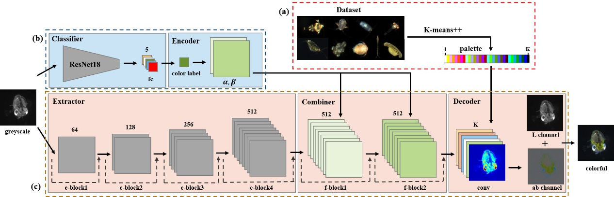 浮游生物图像自动着色算法的神经网络结构示意图