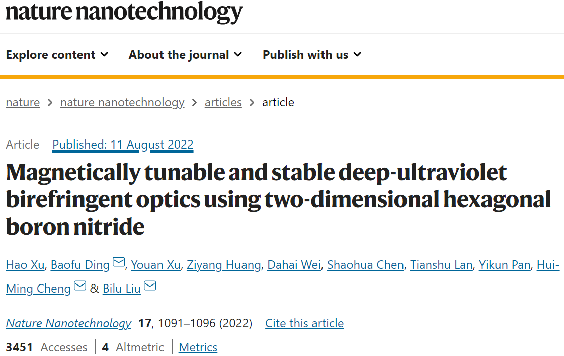 [1]H. Xu,B. Ding,Y. Xu,Z. Huang,D. Wei,S. Chen,T. Lan,Y. Pan,H.-M. Cheng & B. Liu. Magnetically tunable and stable deep-ultraviolet birefringent optics using two-dimensional hexagonal boron nitride. Nat. Nanotechnol. 17,1091-1096 (2022).