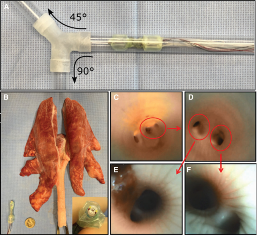 图1. 机器人导航实验。(A)三通管接头转弯实验。(B)动物猪活体外组织与机器人原型机。(C)猪气管内,机器人视角中显示的三个支气管位置。(D)下肺叶支气管位置。(E)从右下叶支气管内观察下一分支。(F)从左下叶支气管内观察下一分支。