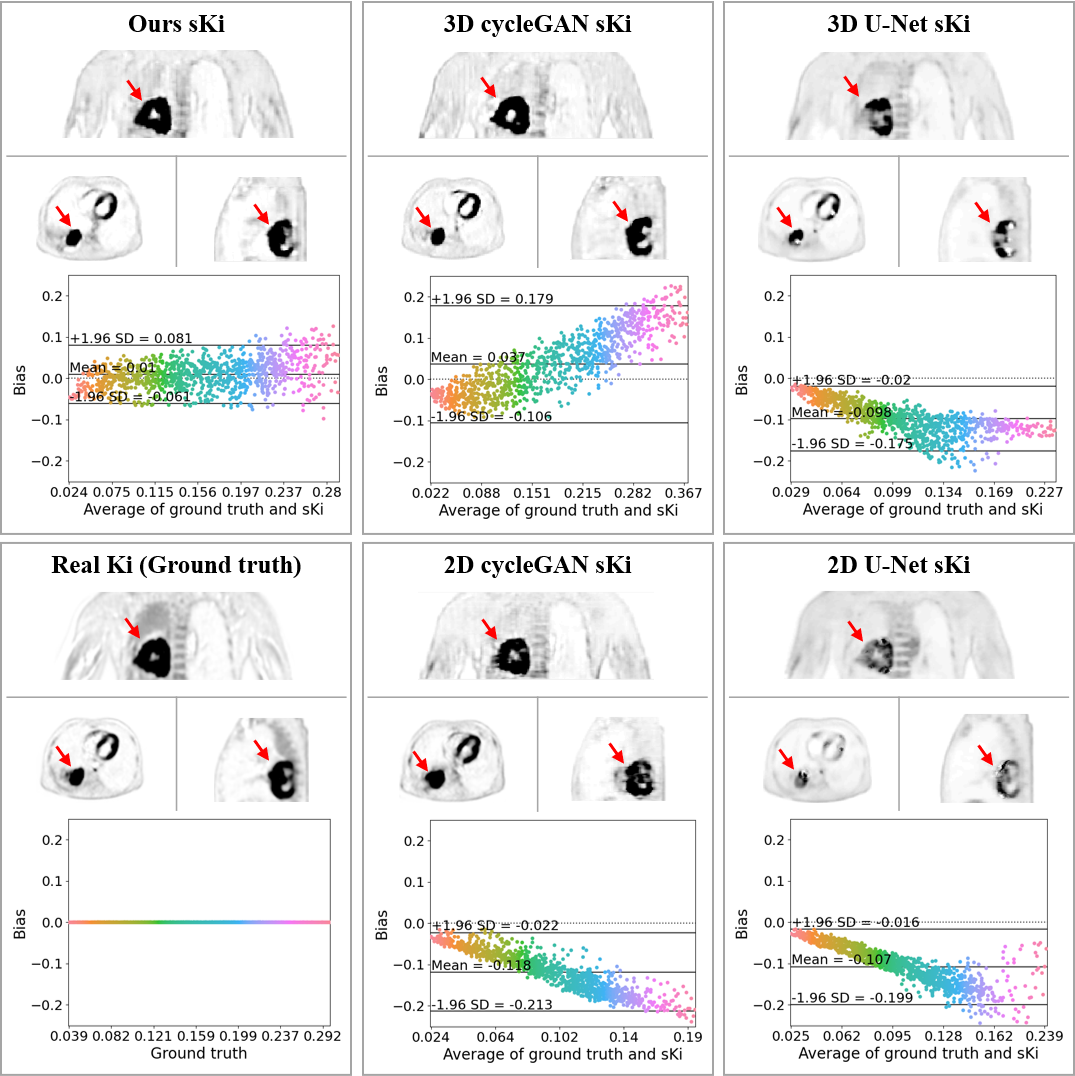 进一步,为分析决特定部位、特定病种和病人的个性化分析问题,团队与临床医院合作实现了半监督学习的动态PET三维参数图像生成的临床前瞻性研究。实现了基于3D生成对抗网络的半监督学习模型,降低了训练数据标签的严格配对要求。我们采用改进的循环生成对抗网络来学习静态PET与Ki参数图像之间的映射关系,顺利获得增强切片间和切片内的注意力来提高图像质量和量化精度。网络生成的Ki图像可以为临床医生给予额外的定量参考,取得更好的诊断指导,而无需实际的动态扫描。为了进一步定量分析合成的Ki图像与参考图像之间的一致性,我们从测试数据中选取了一位患有肺部恶性肿瘤的受试者,描绘并分析了其肿瘤的感兴趣区域(图4)。提出方法取得的合成 Ki图像与真实Ki图像之间的95%一致性限制范围为- 0.061到0.081(平均值为0.01)。而传统3D U-Net、2D cycleGAN 和2D U-Net算法的合成 Ki图像均具有较大偏差。相关研究工作以“Deep learning–based dynamic PET parametric Ki image generation from lung static PET”为题发表于放射与核医学领域权威临床杂志European Radiology(DOI: 10.1007/s00330-022-09237-w),博士生王海燕为论文第一作者。