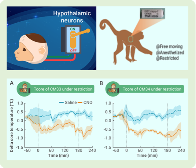 该研究利用化学遗传学手段,顺利获得操控下丘脑兴奋性神经元,首次实现了灵长类动物的可靠体温调节。该研究还探索了灵长类体温调节中枢的功能以及神经网络连接,为潜在的临床转化和空间应用给予理论和实验支撑。