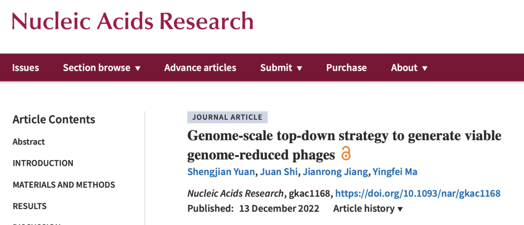 1. Yuan S, Shi J, Jiang J, Ma Y. Genome-scale top-down reduction of phages to generate viable minimal phage genomes. Nucleic Acids Research; 2022, DOI: 10.1093/nar/gkac1168.