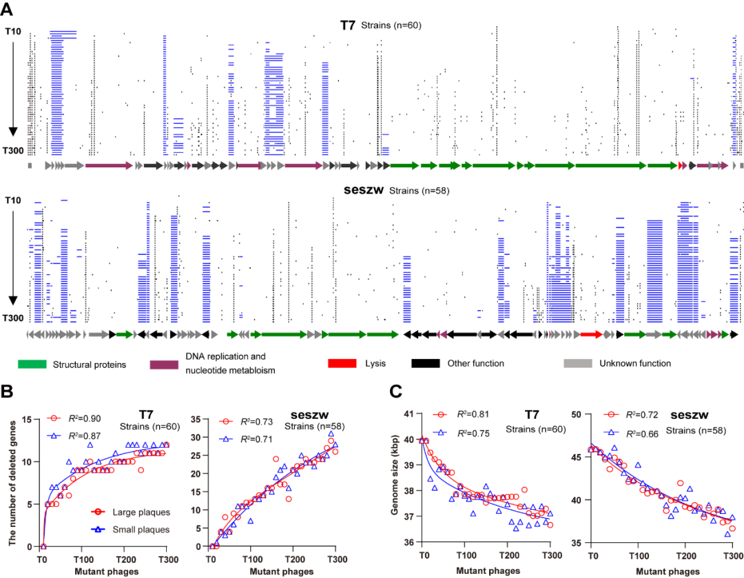 在对CiPGr生成的单克隆突变噬菌体进行测序时,科研团队观察到基因缺失数量随着转接次数的增加而在单克隆突变噬菌体基因组中不断积累。CiPGr应用于四种不同的有尾噬菌体(模式噬菌体T7和T4;沙门氏菌噬菌体seszw和selz),导致这些噬菌体的突变体删除8-23%(3.3-35 kbp)的序列,产生了最简底盘噬菌体。持续的转接过程使具有较大生长优势的突变株将在突变库中占主导地位,并在众多突变株中有更大概率进入下一轮转接过程。因此,单克隆突变噬菌体基因组中基因删除的顺序可能表明这些基因在噬菌体扩增中的重要性顺序,即基因越早被删除,该基因对噬菌体扩增就越不重要(图5)。
