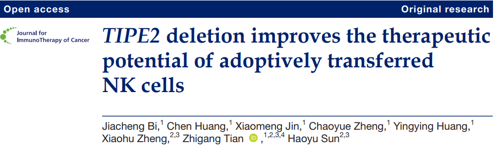 21日,肿瘤免疫治疗学会(SITC,Society for Immunotherapy of Cancer)的官方杂志Journal for ImmunoTherapy of Cancer在线发表了田志刚课题组的最新研究成果”TIPE2 deletion improves the therapeutic potential of adoptively transferred NK cells,报道了在肿瘤微环境的NK细胞中TIPE2分子的表达水平与NK胞的功能耗竭状态相关,顺利获得CRISPR/Cas9技术敲除TIPE2阻滞了NK细胞耗竭状态并显著增强过继NK细胞的抗肿瘤效应,表明靶向敲除TIPE2促进NK细胞免疫治疗的潜在策略。