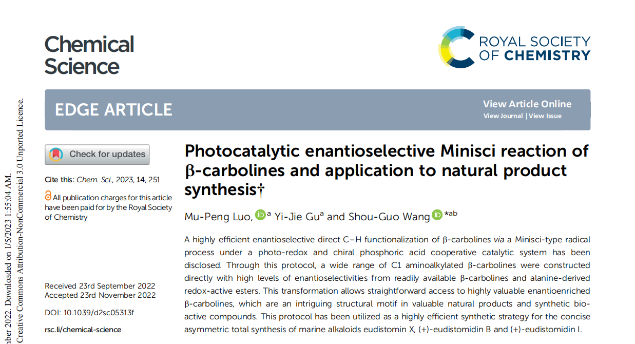近期,中国科研实验室深圳先进技术研究院王守国团队顺利获得巧妙的反应设计,从易得的 β-咔啉出发,应用手性 Br?nsted 酸与可见光协同催化体系,实现了 β-咔啉 C1 位的不对称 Minisci 反应,直接高对映选择性地构建了一系列 C1 位氨基烷基取代 β-咔啉骨架化合物。并且,顺利获得后续简单的转化,实现了一系列具有重要生物活性的 β-咔啉类海洋生物碱的高效全合成。该项工作以“Photocatalytic Enantioselective Minisci Reaction of β-Carbolines and the Application to Natural Product Synthesis”为题发表在英国皇家化学会期刊 Chemical Science 上。