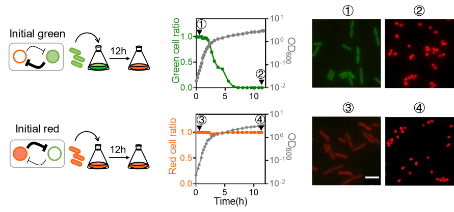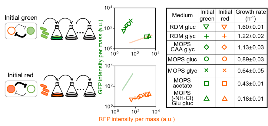 为了研究细胞的生长速率对基因网络是否可以存在影响,科研团队利用了经典合成基因线路——拨动开关线路(the toggle switch1,来研究这种可能性。拨动开关线路由两个相互阻遏的基因所构成,使得该线路在稳态(stable states)下只能存在一种基因处于高表达状态。这样的网络拓扑结构也广泛存在于自然界中,例如:λ噬菌体溶菌-溶原决定,线虫左右味觉神经分化。另外,构成这一线路的元件已经被广泛定量表征,与宿主自生基因调控网络相正交,因此可以排除宿主自身状态对基因线路的直接调控,同时也利于定量分析网络的稳态行为。