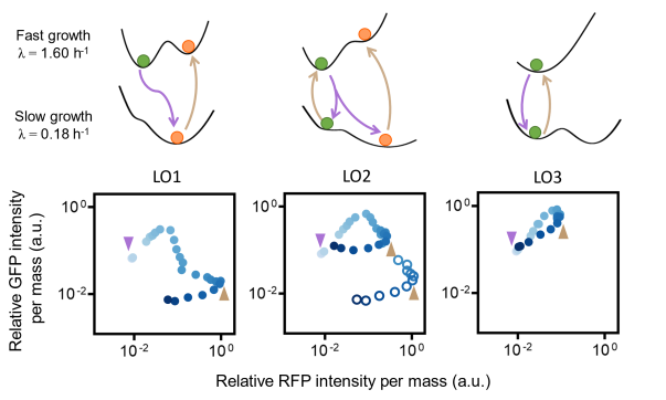 尽管LO2菌株在任何生长速率范围内都表现为双稳态,有趣的是,由于细胞发生了分化,该菌株在生长降档过程中一部分细胞仍能维持绿色状态,一部分则分化为红色,而这一现象是无法被确定性的动力学模型所预测的。科研团队利用势能景观图(potential landscape),定量地研究了不同生长速率下,基因表达的噪声对细胞的命运决定的影响,而后发现,当细胞生长速率处于较慢或者较快时,势能景观中,两个稳定态之间的能垒较低,这意味着细胞更容易因噪声而发生状态的切换;因而,LO2菌株在处于降档过程中,一部分细胞在随机性的有助于下发生状态切换。