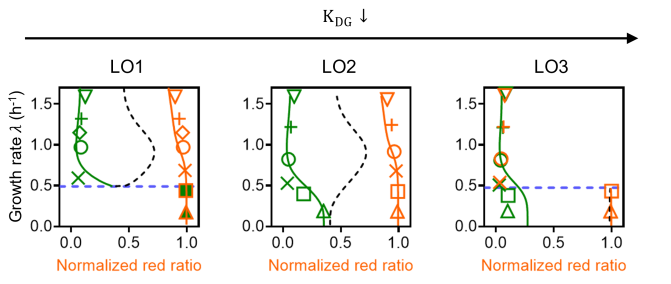 科研团队顺利获得扰动细胞生长速率来探究这一问题,顺利获得动态改变培养基的成分,来实现细胞生长速率切换,并实时追踪细胞的状态。第一时间将细胞在快速生长条件下培养至生理稳定状态,再切换到营养贫瘠的培养基(生长降档),等细胞恢复到生理稳定状态再切换回到营养丰富的培养基(生长升档)。由此发现,初始状态为绿色状态的LO1菌株在生长降档过程最初阶段,红绿两种状态都同时发生升高;随着红色状态的升高,绿色状态开始下降,并最后稳定在红色状态。而LO3菌株,由于在慢速生长条件下为双稳态,全过程维持绿色状态不变。科研团队LacI和TetR的表达速率与瞬时生长速率之间进行了准稳态近似,构建了基因线路的确定性动力学模型,该模型能很好地捕捉细胞在升档和降档过程中的动力学特征。
