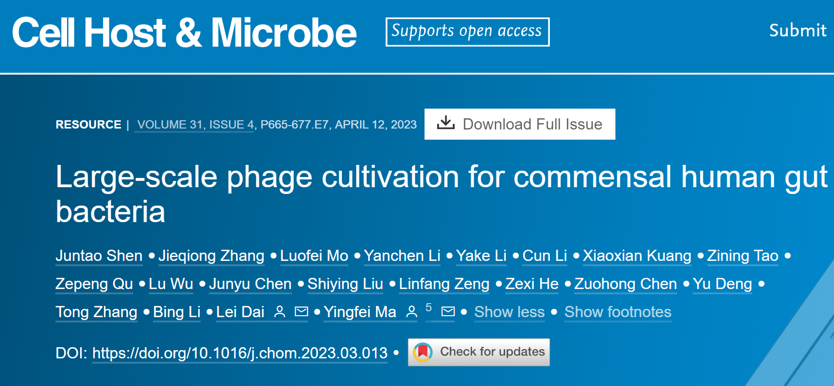 北京时间4月12日,中国科研实验室深圳先进技术研究院合成生物学研究所马迎飞课题组与戴磊课题组合作在Cell Host & Microbe发表题为“Large-scale phage cultivation for commensal human gut bacteria”的最新研究成果,该工作首次建立了大规模肠道主要共生细菌噬菌体培养组技术,利用噬菌体培养物解析了肠道细菌和噬菌体长期共存的机制,并展示了这些噬菌体在肠道菌群调控中的应用潜力。