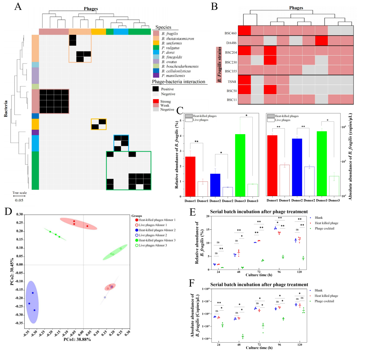 最后,为了证明使用GPIC噬菌体调节人类肠道菌群的可行性,团队选择了8种具有不同基因组序列和不同宿主特异性的脆弱拟杆菌噬菌体,组成了具有广宿主范围的噬菌体鸡尾酒。在三位供体粪便样本的肠道菌群体外培养体系中,噬菌体添加24h后,脆弱拟杆菌的丰度均显著降低了,同时伴随着菌群组成的剧烈变化(图3C和3D)。在更长时间的陆续在培养中,噬菌体鸡尾酒也可以降低脆弱拟杆菌的丰度(图3E和3F),显示出对目标物种的持久敲低作用。