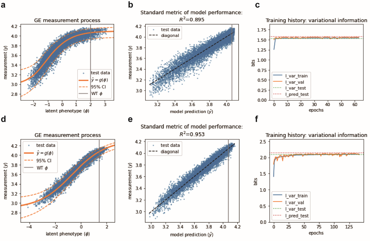 3 CreiLOV非特异性上位效应建模与表型预测:(a-c)基于G-P图加性模型;(d-f)基于G-P图黑箱模型