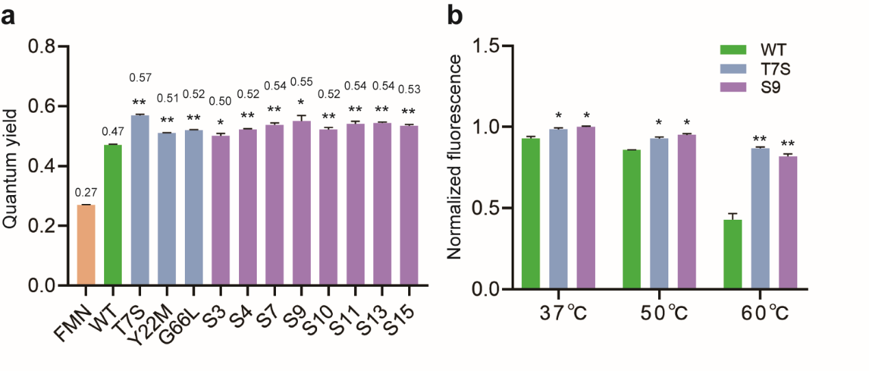 5 CreiLOV优势突变体表征:(a)荧光量子产率;(b)热稳定性