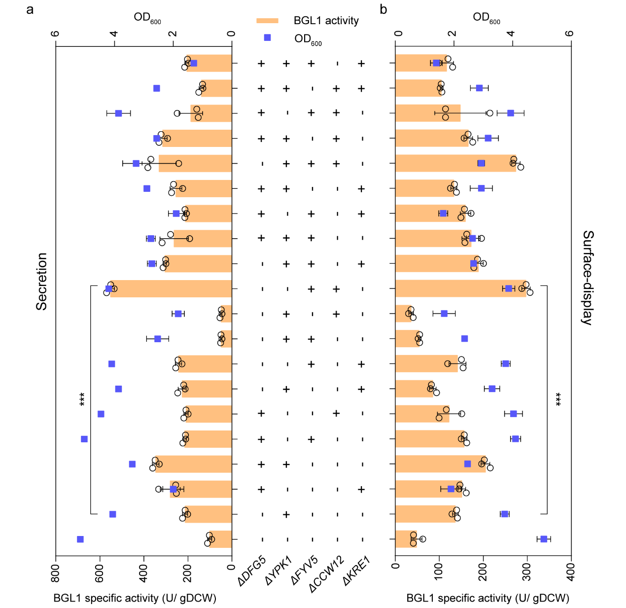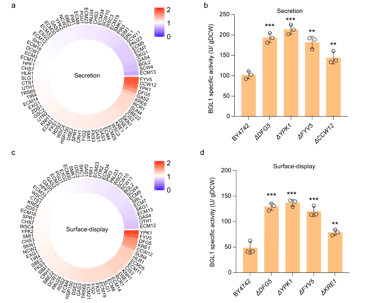 在本研究中,作者第一时间选取来自Saccharomycopsis fibuligeraβ葡萄糖苷酶(β-glucosidase, BGL1)作为报告蛋白,以其分泌(secretion, sBGL1)和表面展示表达的活性(surface-display, dBGL1)作为指标,系统性地评估了79个参与细胞壁合成基因的敲除对sBGL1和dBGL1活性的影响。经过96深孔板培养筛选以及摇瓶发酵二次验证后发现,DFG5、YPK1、FYV5以及CCW12KRE1基因的失活,能够显著提高sBGL1或dBGL1的活性(>40%)(图1)。