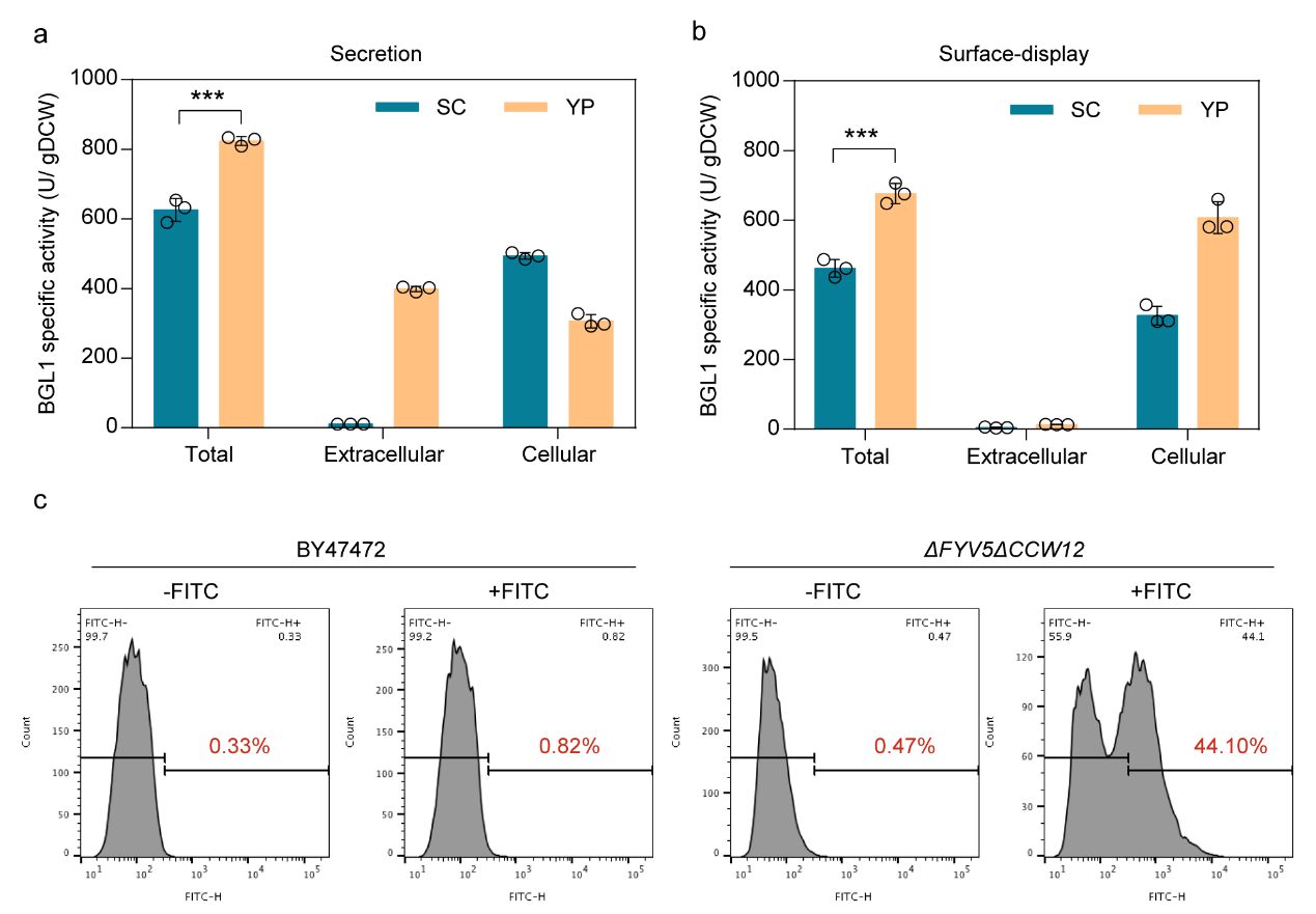 3. 富培养基YP使ΔFYV5ΔCCW12菌株分泌和表面显示BGL1活性进一步增强。