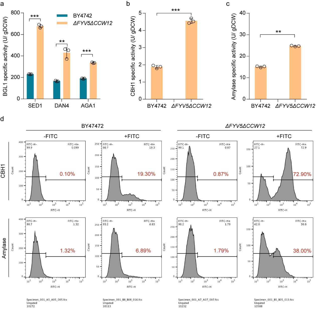 随后,为了进一步探究上述基因的改造是否存在组合效应,该研究对上述基因靶点进行组合敲除,包括双敲除,三敲除和四敲除。顺利获得分析其对分泌和表面展示BGL1活性的影响发现,FYV5CCW12双敲除菌株表现出最优的BGL1胞外表达能力,其sBGL1和dBGL1活性相较野生型菌株分别提升了4.41和5.14倍(图2)。