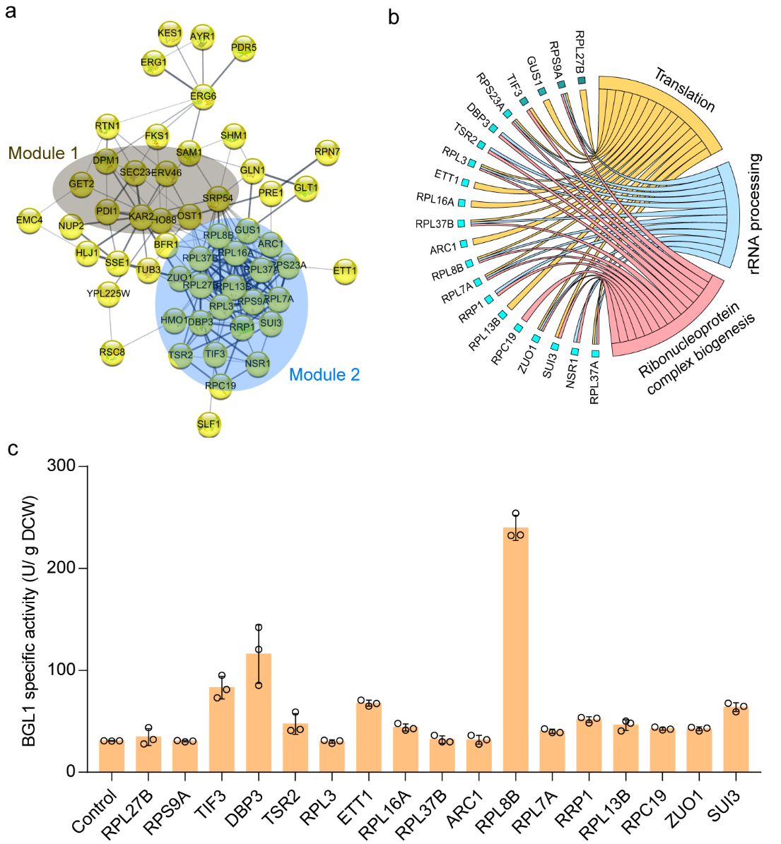 为了探究FYV5CCW12双敲除菌株提升重组酶胞外表达的潜在机制,该研究对改造菌株和野生型菌株进行了蛋白质组学测试,发现FYV5CCW12双敲除能引发系列蛋白的上调表达,除了分泌途径关键节点—内质网蛋白加工过程(protein processing in the ER),蛋白翻译(protein processing in the ER and protein translation)过程也是主要的被调控模块之一(图5)。顺利获得逆向代谢工程研究发现,过表达12个蛋白翻译过程的蛋白,能提高BGL1胞外活性,其中,过表达RPL8B、DBP1、TIF3、ETT1SUI3能将BGL1活性分别提高6.8、2.7、1.7、1.2和1.1倍(图5c)。