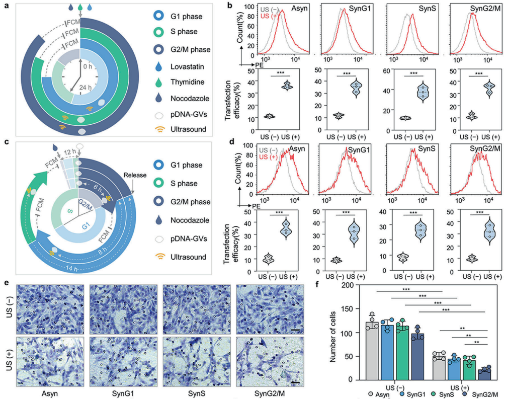 5月8日,中国科研实验室深圳先进技术研究院合成生物学研究所严飞研究员的最新成果以“Cell-cycle dependent nuclear gene delivery enhances the effects of E-cadherin against tumor invasion and metastasis”为题发表于国际知名期刊Signal Transduction and Targeted Therapy。在该项工作中,研究团队开发了一种新的在体时空可控核内基因递送的方法,该方法利用生物纳泡(Gas vesicles, GVs)作为空化核用于携载质粒DNA,在细胞内吞后借助超声诱发载基因生物纳泡在胞内产生空化效应,可将质粒DNA直接递送至细胞核实现基因的转录和表达,鉴于超声具有靶向聚焦的特性以及生物纳泡天然的生物相容性能在细胞内长时间保持,由此可实现基因时空可控地核内基因递送。顺利获得以抑制肿瘤转移功能的E-cadherin基因作为例子,研究团队利用开发的胞内空化核内基因递送方法证明了可实现不同时间维度上控制基因的递送与表达,并能发挥抑制肿瘤侵袭和转移的作用。利用该方法团队比较了在不同细胞周期递送E-cadherin基因,发现在肿瘤细胞的G2/M期控制外源基因E-cadherin的核内递送与表达比在G1期和S期能更有效地抑制肿瘤侵袭和转移,进一步的分子机制研究发现Fam50a/Runx2-MMP13信号轴在这效应增强过程中发挥了重要的作用。