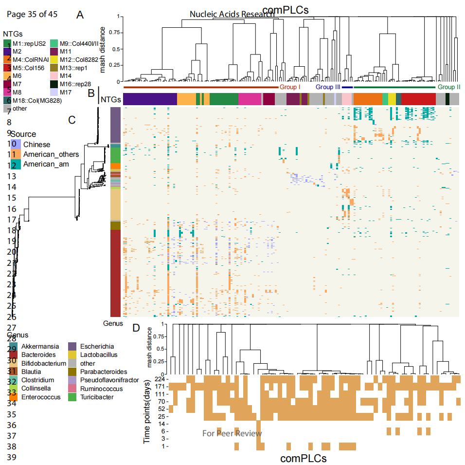 以不同国家的肠道宿主样本为参考,团队在前述PLSs集中鉴定了402个能跨属传播的PLCs,其中部分PLCs在不同国家的样本中均有检出。以多样性为前提,对代表的175个宽宿主范围PLCs分析,团队发现拟杆菌属、埃希菌属和双歧杆菌属是这些宽宿主范围PLCs最常见的宿主,并且不同的组别(Group)显示出不同的宿主分布差异(图2A、2B与2C)。其中宿主范围最宽的PLCs(Clstr_417)可以横跨5个门、24个属传播。团队还发现,对于测试的宽宿主范围PLCs,有61.2%的PLCs可以稳定存在至少150天,或是其广泛传播的基础(图2D)。