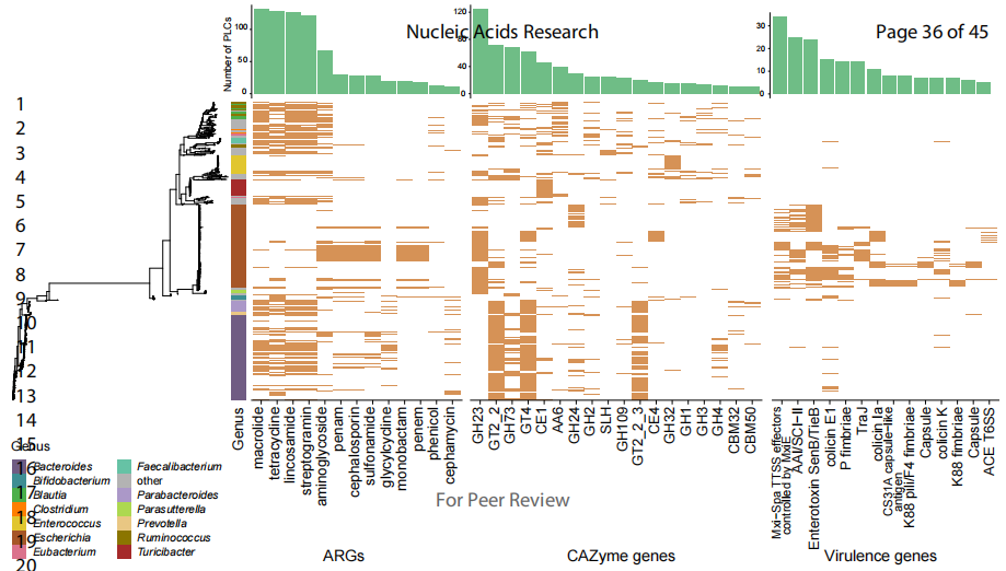 由于质粒常携带适应性基因,团队重点分析了人肠道质粒编码的抗生素耐药性基因,毒力基因和碳水化合物活性酶基因(图3)。结果发现,在分析的PLCs中,有6.3%(339个)的PLCs携带耐药性基因,个别PLCs甚至携带多达7种耐药性基因。不同种类的抗生素基因显示出不同的宿主分布差异也提示肠道微生物组可以作为抗性基因库。类似的宿主特异性分布现象也在碳水化合物活性酶基因上出现,其中,拟杆菌是该类基因最常见的宿主。大肠杆菌是携带拥有毒力基因PLCs最多的宿主(95.8%)。有趣的是,可能是由于拥有更大的基因组,接合型的BHR质粒携带这三类适应性基因的频率高于可移动型的BHR质粒。