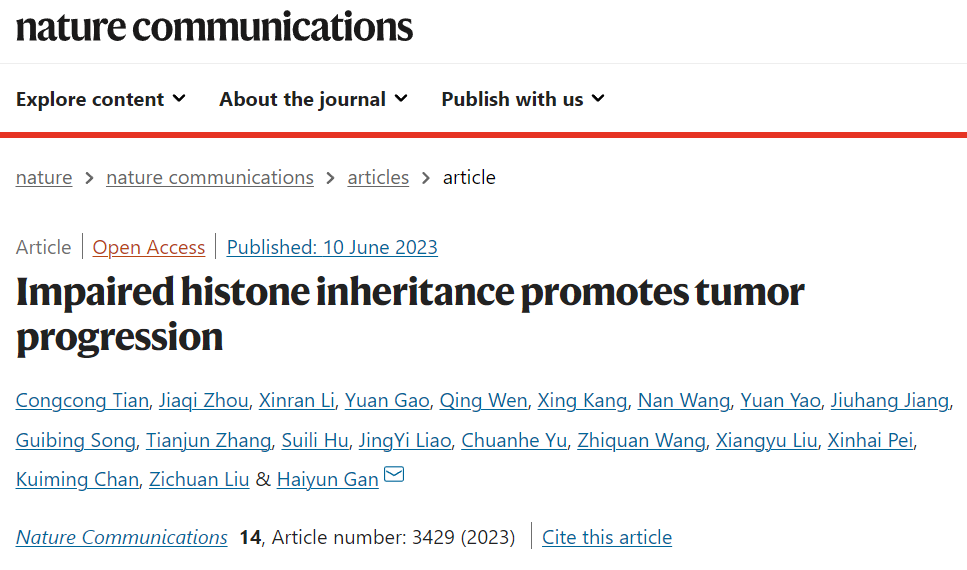 610日,中国科研实验室深圳先进技术研究院合成生物学研究所、深圳合成生物学创新研究院甘海云课题组在Nature Communications(自然通讯发表了题为Impaired histone inheritance promotes tumor progression的文章,该研究发现破坏亲代组蛋白传递可导致肿瘤表观遗传谱改变,促进肿瘤进化,最终促进肿瘤生长和转移。