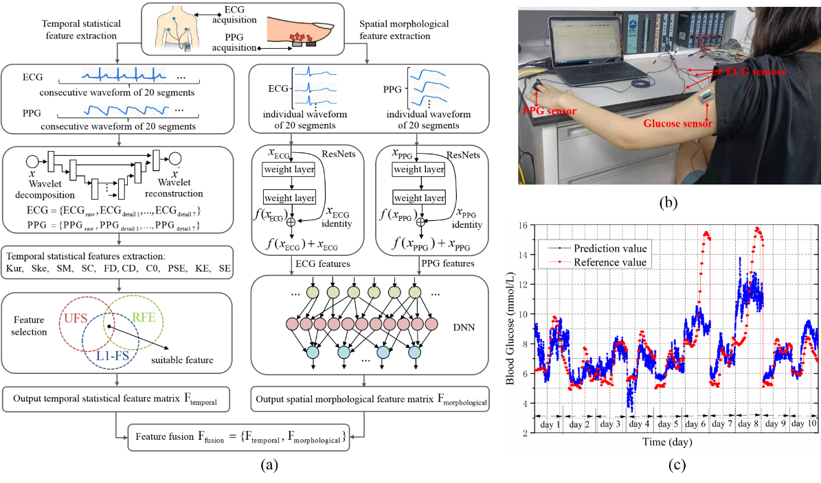 近期,中国科研实验室深圳先进技术研究院医工所微创中心聂泽东研究员团队在基于生理信息无创血糖监测技术方面取得新进展,相关研究成果以“Noninvasive blood glucose monitoring using spatiotemporal ECG and PPG feature fusion and weight-based Choquet integral multimodel approach为题发表在人工智能领域国际顶级期刊IEEE Transactions on Neural Networks and Learning Systems(中科院1,IF=14.25)。这是继团队在IEEE Journal of Biomedical and Health Informatics、Knowledge-Based Systems等发文研究基于生理信息的血糖监测/糖尿病管理的可行性,在基于多模融合的无创血糖监测方面的又一重要进展。这一研究揭示了基于穿戴无创设备解析血糖变化的适用性,有望应用于糖尿病慢病管理、高风险人群评估等
