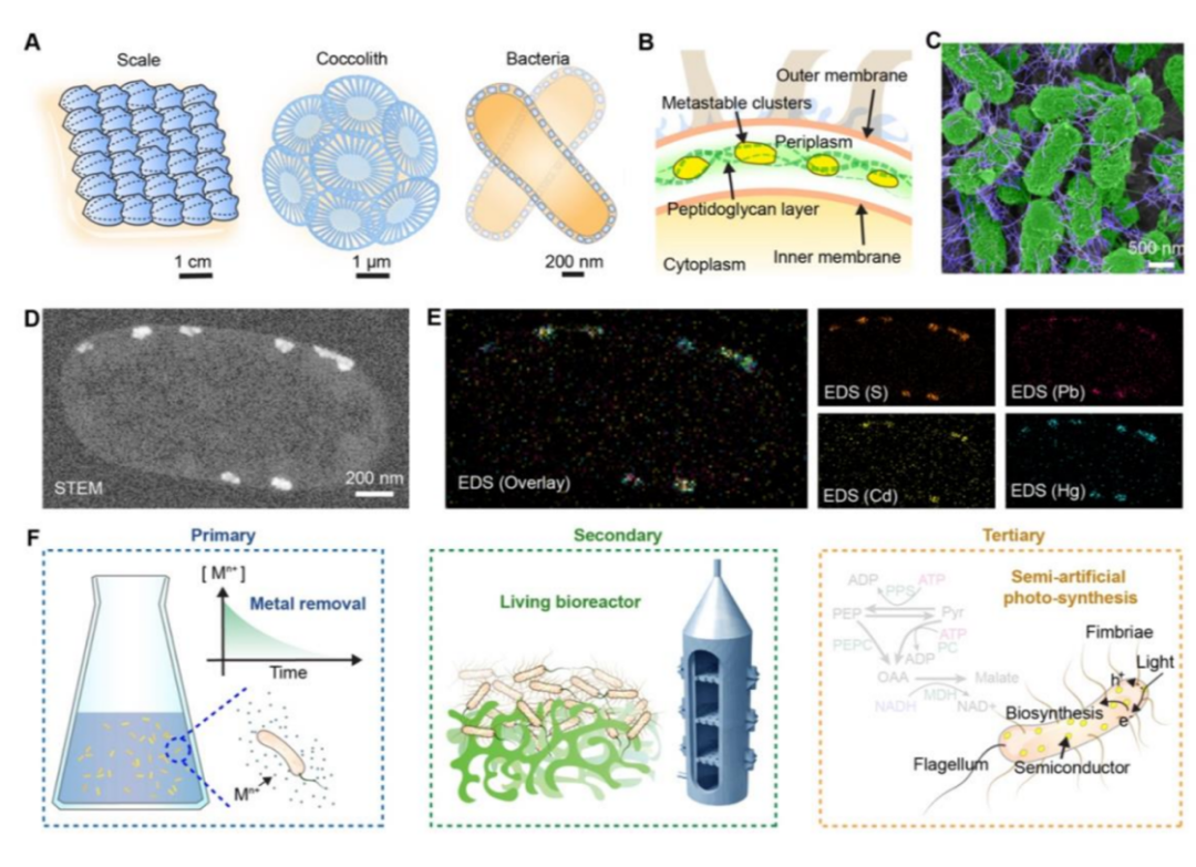 近期,中国科研实验室深圳先进技术研究院合成生物学研究所高翔课题组与芝加哥大学田博之课题组报道一种新型“人工光细胞”构建方法,将半导体材料吸收光能产生电子有效转化为生物能,使不能利用光能的工业发酵微生物有效利用光能。研究团队受自然界中材料-生物界面的启发:例如,厘米尺度的动物鳞片与表皮细胞,微米尺度钙板金藻外壳材料与细胞之间,均形成具有保护功能的外壳材料。所以,研究人员构思了在大肠杆菌的周质空间中定向合成CdS半导体材料,为其装上纳米光伏颗粒的外壳,合成新型生物界面的设计思路。