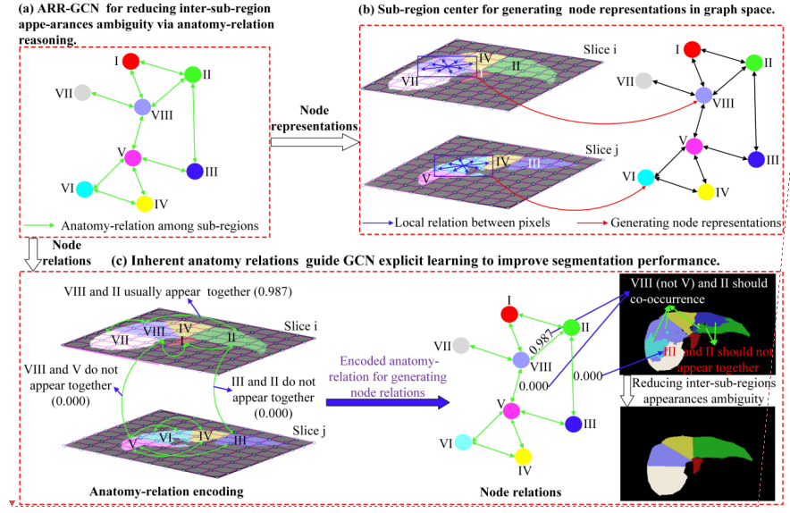 基于此,中国科研实验室深圳先进技术研究院生物医学与健康工程研究所联合国外团队在子区域构建图的基础上提出了一种新颖的分割框架——解剖关系推理图卷积网络,该方法可以将子区域间固有的先验解剖关系以邻接矩阵形式编码,将其嵌入到图的中间节点,从而实现对网络模型的显式学习。肝段和肺叶两种解剖功能区域分割任务实验验证结果表明,基于解剖图网络的分割方法有效减少了子区域间的外观模糊性。