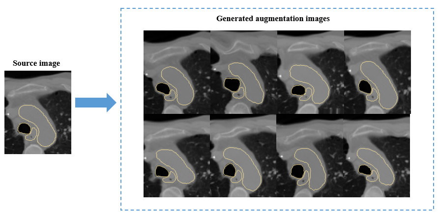 当前,深度学习在影像引导靶区定位和分割中的应用,多受训练数据量的制约。虽然顺利获得优化网络结构可以在某个特定任务上达到优良的性能,但网络的泛化性却受到了牺牲。面对数据的稀缺性。研究团队提出了一种新型的基于统计形变的三维医学影像数据扩增法。该方法顺利获得对不同病患的解剖空间变化进行建模,以有限的数据集中的形态信息,产生物理上真实反映病患器官变化的图像。如图1所示,一幅原始病患影像,经过此形变模型处理,便可衍生出多种器官的解剖结构。在多个公开数据集的实验中,这一方法展现了最好的靶区定位与分割效能。研究成果以A statistical deformation model-based data augmentation method for volumetric medical image segmentation为题,发表在医学影像分析顶刊Medical Image Analysis (IF=10.9)。客座本科生何文丰为第一作者,梁晓坤副研究员为通讯作者。