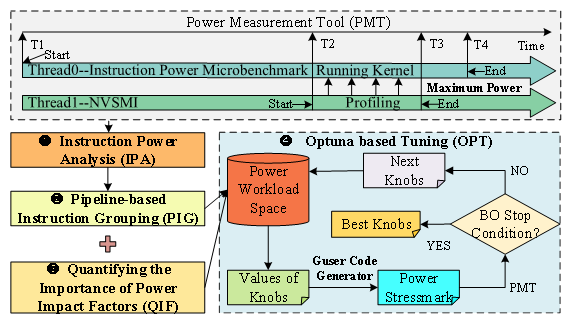该项研究致力于准确评估通用计算GPU(GPGPU)的极限功耗,提出了一种GPGPU极限功耗测试程序自动生成方法, 为GPGPU供电和散热系统的优化设计给予依据。“Power stressmark”对于估计GPGPU 热设计功耗 (TDP) 以确保高效的功耗控制至关重要。Guser是首个生成 GPGPU Power stressmark的系统方法。主要包括三个关键方法:第一时间,指令功耗分析,分析了每个算术指令在不同操作数数据宽度下的功耗行为、执行时间、流水线利用率和硬件单元占用情况;其次,基于流水线的指令分组,用于将所有 PTX 指令分类为多个组;最后,量化功耗影响因子的重要性,用于选择少量但重要的可调节参数。基于GPGPU Tesla T4(图灵架构)和 Tesla A10(安培架构)的实验表明,使用Guser为 T4 生成的 Power stressmark(T4-stresser)功耗达 109.3 瓦特,以及为 A10 生成的Power stressmark(A10-stresser)功耗达 238.7 瓦特,分别比当前最先进CPU Power stressmark方法高出 48.7% 和 73%。 此外,T4-stresser 和 A10-stresser 的功耗明显高于当前主流的三个基准测试程序集(Cactus、Rodinia 和 Parboil)中任何基准测试所达到的功耗。