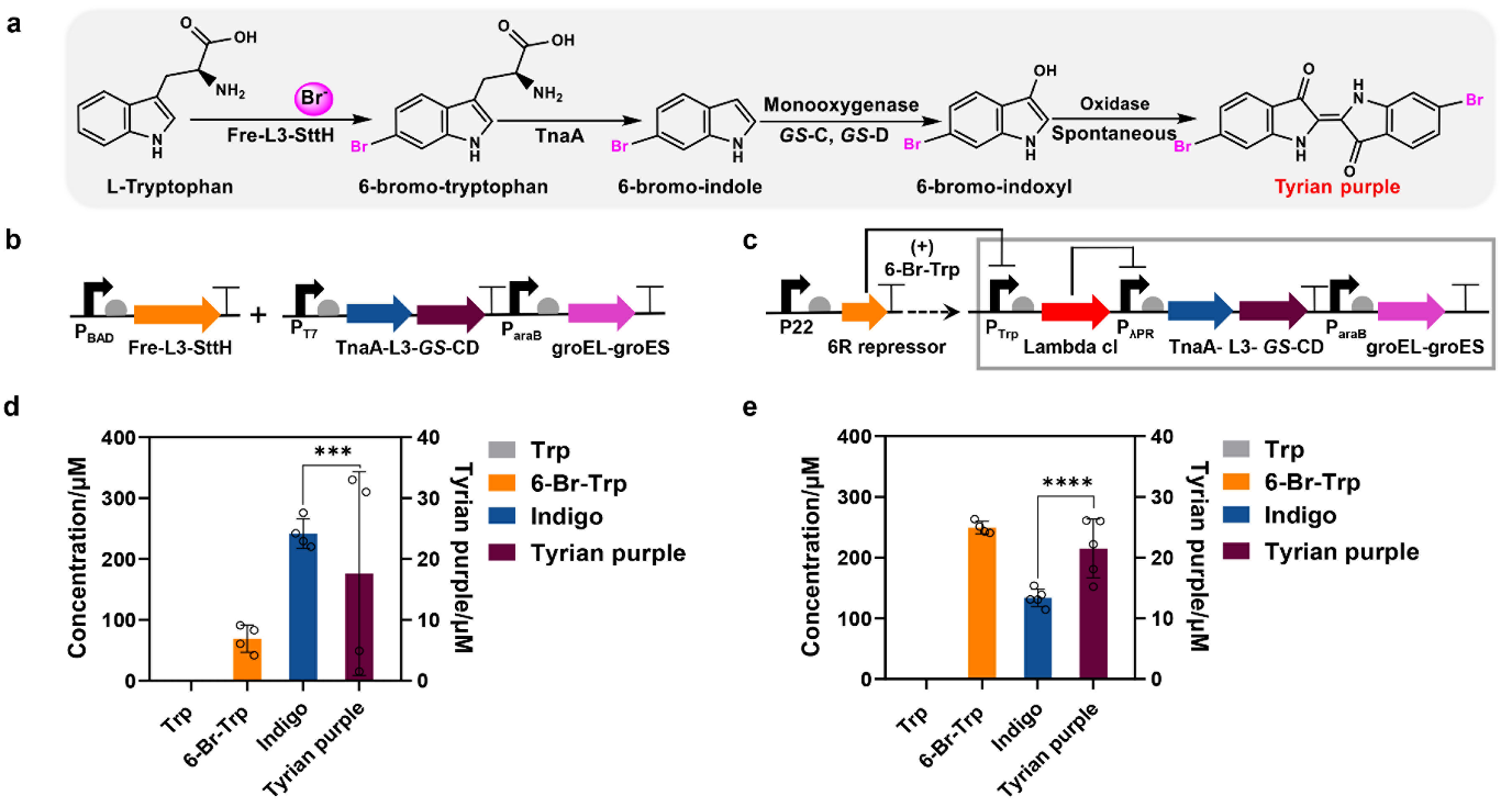研究团队前期在Providencia Rettgeri GS-2菌中发现一个新的双组分吲哚氧化酶GS-CD,其合成Tyrian purple的效果比之前报道的单加氧酶MaFMO和细胞色素P450CYP102G4更好。该研究还使用了一条刚性的短肽L3将色氨酸酶(TnaA)与GS-CN端融合,取得双功能融合酶TnaA-L3-GS-C基因GS-D被放置在GS-C的下游,由一个独立的RBS控制其翻译。TnaA-L3-GS-C+GS-D(TnaA-L3-GS-CD)体内催化6--色氨酸合成Tyrian purple转化率高达67.5%,可用于Tyrian purple的生物合成(图4