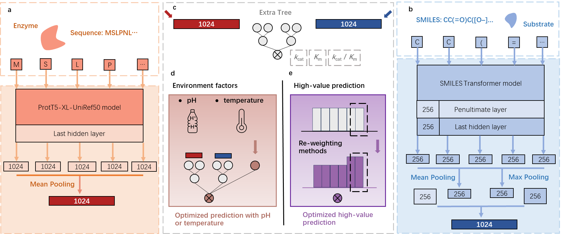 研究人员们尝试利用计算方法加速酶动力学参数的预测过程,但当前的模型主要集中在单独的kcat或者单独的Km的预测上,顺利获得这些工具计算得到的kcat / Km的数值往往与实验测量的真实值明显偏离,而这恰恰是反映催化效率最直接、最关键的参数。此外,当前模型未考虑真实生物实验场景下的适应性,如会显著影响测得的酶动力学参数数值的环境因素,生物学家关心的特定区间的预测性能等。这些局限性使得当前工具停留在理论模型的开发和数据分析上,并未对酶挖掘和定向进化等真实生物实验中面临的挑战产生实质性的影响,而解决这些挑战对下游应用具有重要意义。