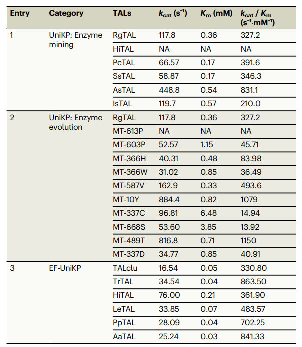 最后,为了探索UniKP及其衍生框架在酶工程领域的实际应用,研究团队以类黄酮合成中的关键限速酶,酪氨酸脱氨酶(Tyrosine ammonia lyase, TAL)为例来进行挖掘和进化。实验结果表明,UniKP有效地识别了在数据库中TAL的同工酶里以及已知TAL的突变体里的高活性TAL酶,无论是挖掘新酶,还是进化已有酶,都得到了显著提高的催化效率,其中RgTAL-489T的kcat / Km值比野生型酶高出3.5倍。此外,衍生框架EF-UniKP也可以在考虑环境因素的情况下,精准识别高活性的TAL酶,验证的5条序列kcat和kcat / Km值均优于野生型TAL,最高的的kcat / Km值比野生型酶在给定pH情况下高出了2.6倍。该结果证实了UniKP可以有效的加速酶挖掘和进化的过程,有望成为有助于生物催化、药物发现、代谢工程等领域的强大工具(表1)。