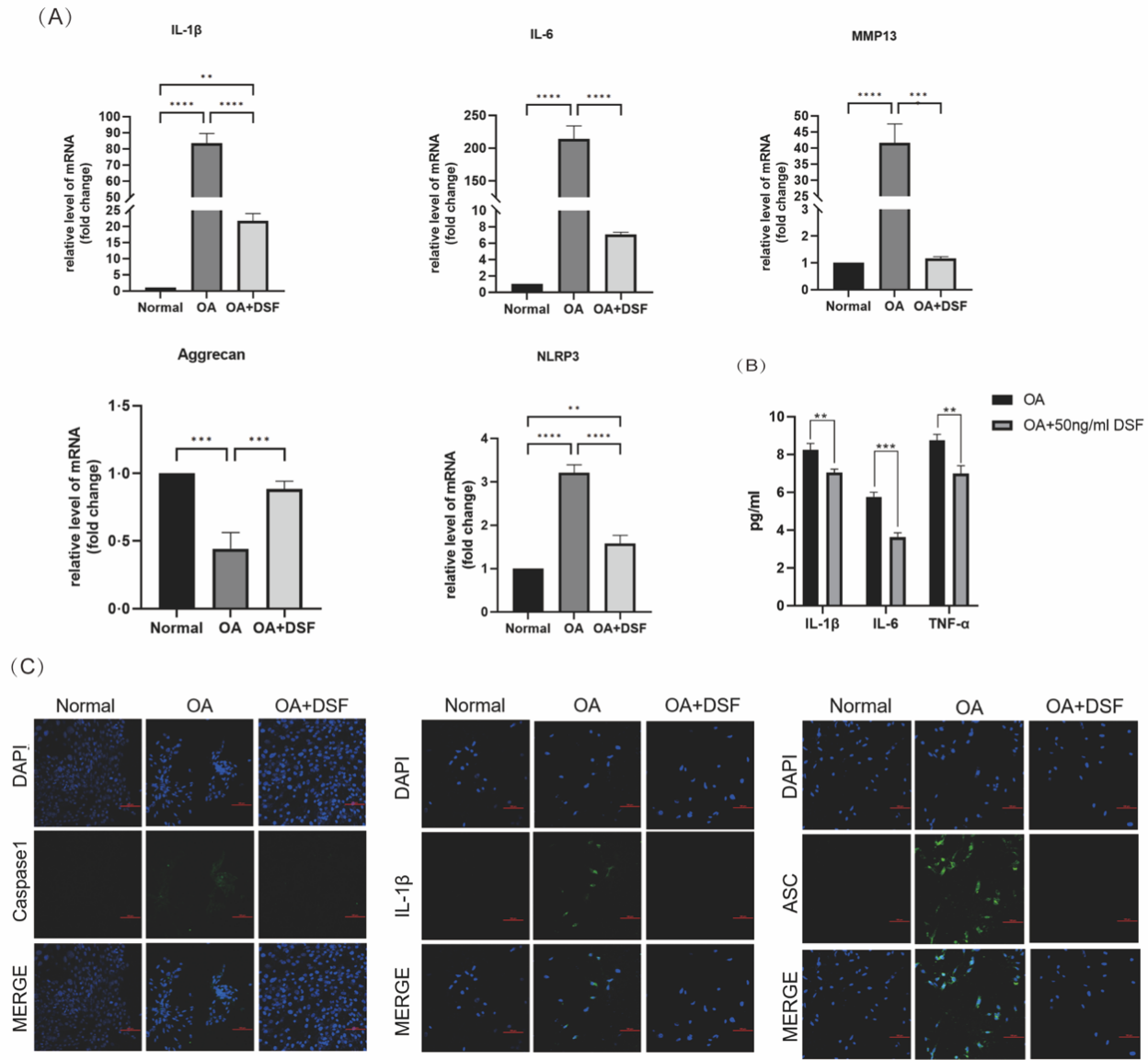 为了克服这一难题,研究者们第一时间评估了 DSF的细胞毒性,发现其在100 ng/mL 浓度以下没有明显的细胞毒性,且对软骨细胞在促炎因子白介素-1(IL-1 )刺激下具有保护效果。此外,DSF显著抑制了促炎细胞因子IL-1 , IL-6, MMP13等的表达(图1)。