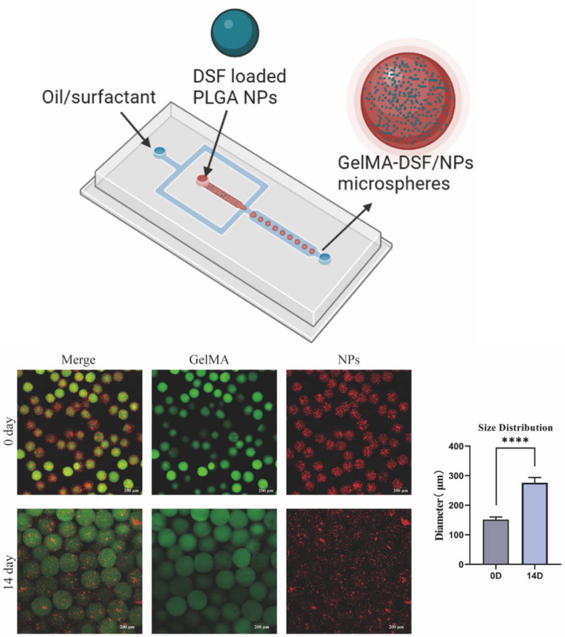 图2. 微流控制备双层包裹的微凝胶示意图以及微凝胶在生理盐水中的溶胀行为评估。