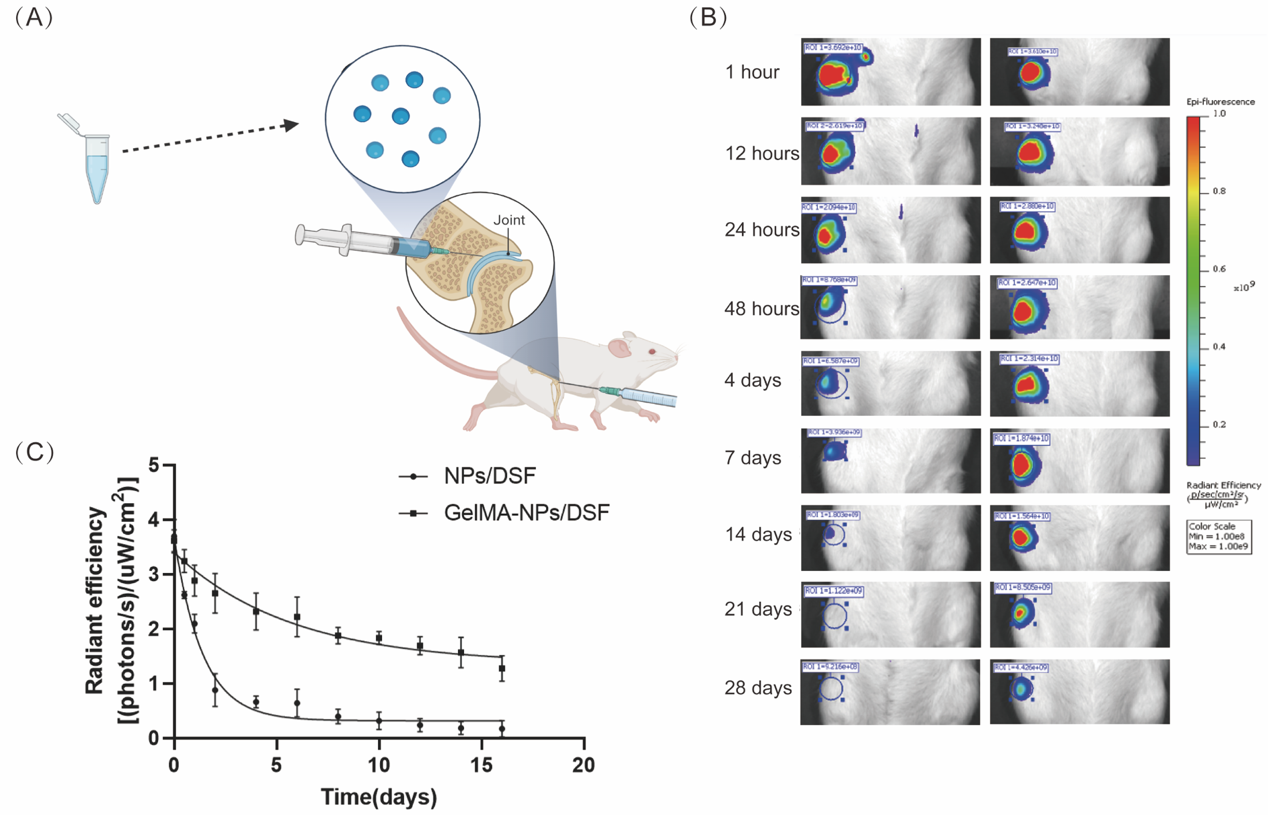 研究团队进一步开发了一种双层包封方法, 将DSF封装于聚乳酸-乙醇酸共聚物的纳米颗粒中,并顺利获得微流控的方法进一步将纳米颗粒包封在明胶甲基丙烯酸酯微凝胶中(图2)。体外及活体成像研究结果表明,微凝胶双层封装的方式减少了DSF在前期的药物突释, 延长了DSF的治疗窗口,双层包封的方法也提高了其在关节病灶内的停留时间,优化了DSF的药代动力学表现(图3)。