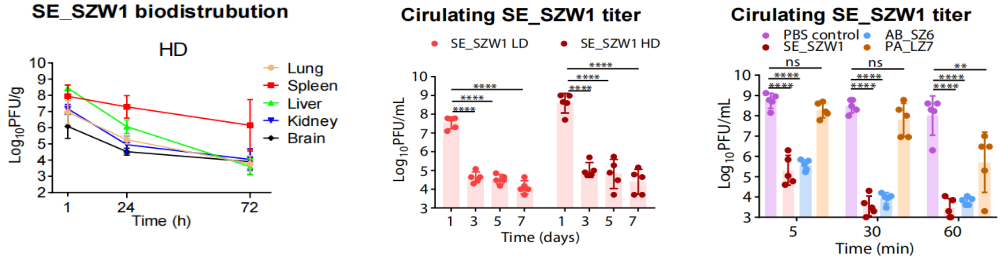 基于以上背景,研究团队以三种不同种类噬菌体为研究对象,探索其在哺乳动物体内的代谢和分布规律及其对于动物机体安全性的影响(图1)。在对大鼠单次给药1小时后,噬菌体(以SE_SZW1为例)主要分布在脾脏和肝脏;重复给药5分钟后,血浆噬菌体滴度与第一次给药相比下降 2-3 数量级(图2),并且不同噬菌体的刺激均可引起血浆中沙门噬菌体SE_SZW1的加速清除(图2)。