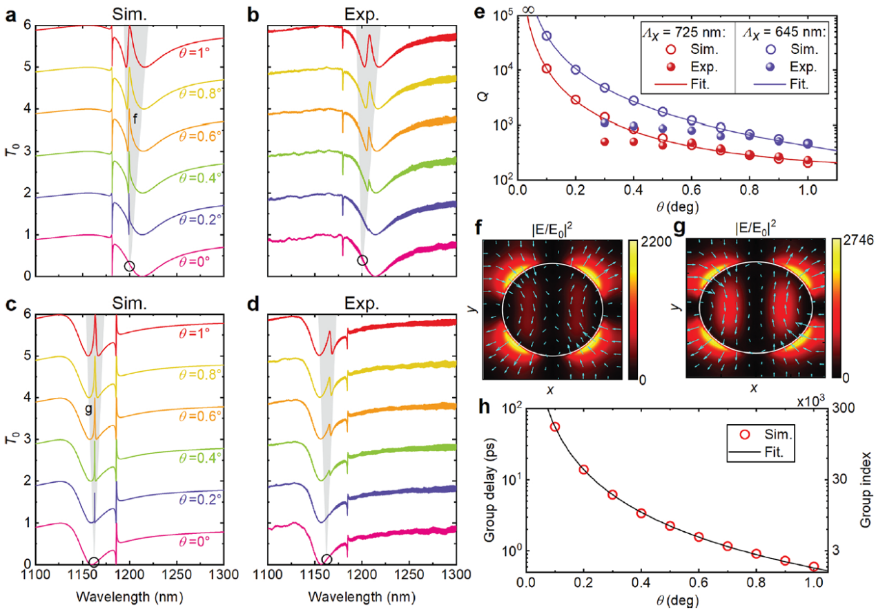 针对超构表面采用类电磁辐射透明(EIT)现象实现慢光效应所面临的高损耗问题,研究团队提出了一种基于晶格共振与晶格共振发生耦合诱导产生的新型类EIT现象,极大地抑制了其损耗,从而在100纳米高度的硅纳米柱阵列上实现了慢光效应(光速减慢了1万多倍)。于此同时,团队在实验上测得高达2750的超高品质因子,数倍于现有纪录(483)。该研究还进一步发现了一种具有陆续在域束缚态(BIC)特性的集体型类EIT现象,其品质因子和慢光指数在理论上均按照反二次函数发散到无穷大。这一创新设计为实现超高性能的慢光光子芯片器件给予了新的思路。