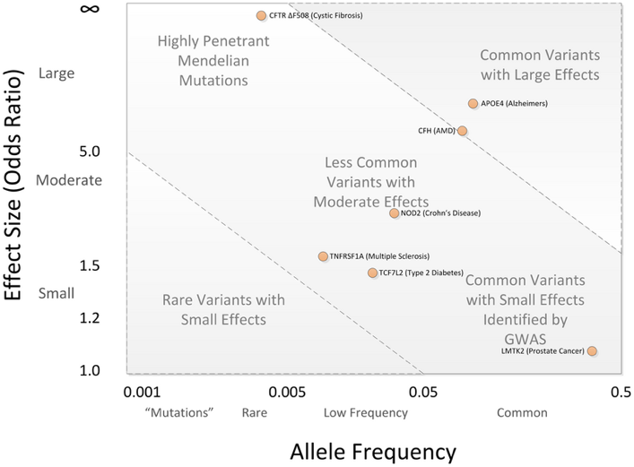 1 突变体/单碱基多样性随着发生频率的下降造成更高的外显率。当等位基因频率小于0.005且概率比例(odds ratio)大于5时,该突变体基本遵循孟德尔遗传,而常见单碱基多样性(发生频率大于0.05)通常难以产生较大的概率比例,只有在捕捉到罕见单碱基多样性时该等位基因才可能会对目标性状具有有较大影响。
